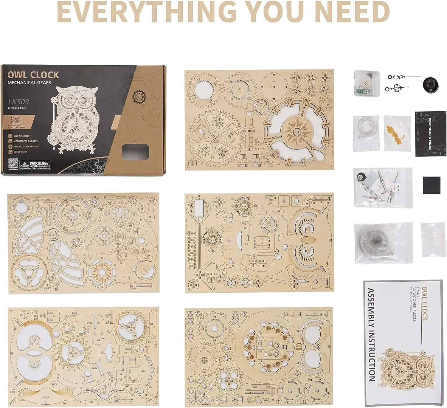 Robotime ROKR 3D Wooden Puzzle Owl Clock Model Building Kit Toys for Children Kids Boys